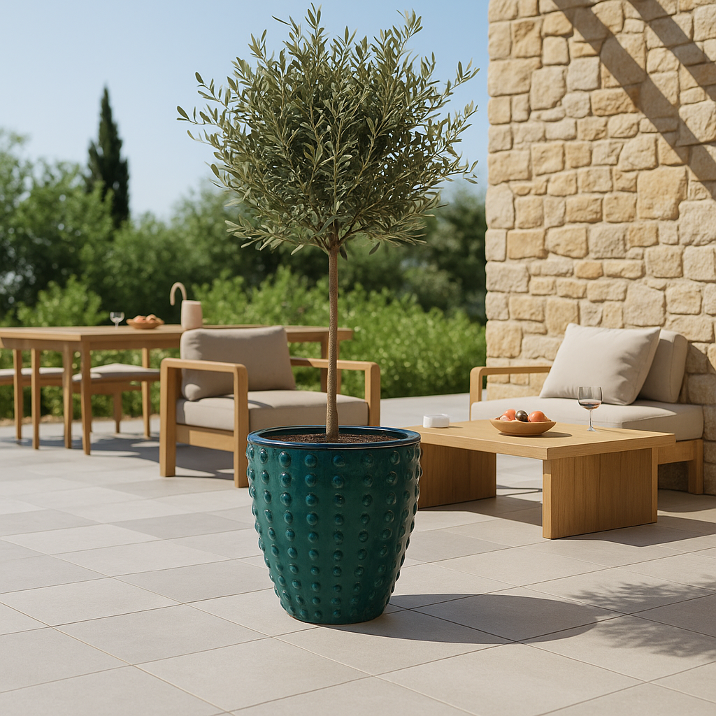 Glazura v Petrolejově modré barvě propůjčuje květináči nádherný lesk a vytváří výrazný kontrast se zelení rostlin. Tím zdůrazňuje jejich přirozenou krásu a dodává každému prostoru přímořskou atmosféru.