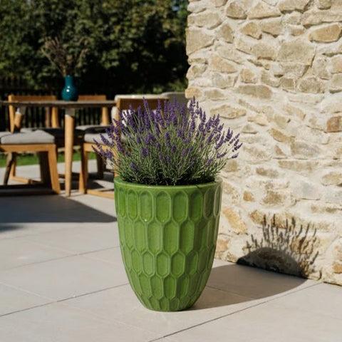Květináč Daudet z glazované terakoty v sobě spojuje řemeslnou preciznost a výrazný design, který promění každý venkovní prostor v místo s příběhem. Jeho velkorysý tvar a fascinující hexagonální reliéf vytvářejí jedinečný vizuální rytmus, který zaujme na první pohled. Každá buňka vzoru je dokladem mistrovské ruční práce – dodává květináči hloubku a charakter.