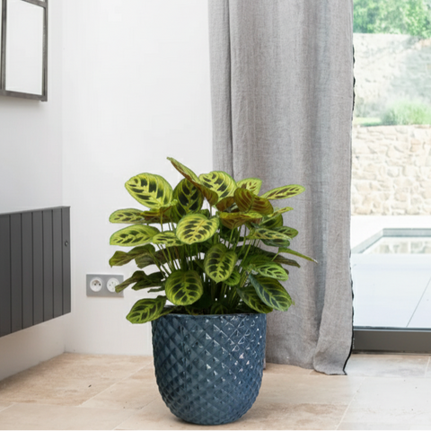 Díky odolnému materiálu a kvalitní glazuře je ideální pro venkovní použití – odolá dešti, slunci i mrazu, přičemž si zachová svůj půvab po mnoho let. V Anticky modré barvě působí svěže a energicky, dodává zahradě i terase živý středomořský nádech.