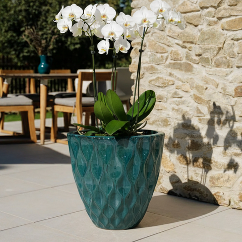 Je pevný, mrazuvzdorný a odolný vůči povětrnostním vlivům, což z něj činí ideální doplněk pro terasy, zahrady či vstupní prostory. Anticky modrá barva dodává rostlinám jedinečný jas a energii – vytváří živý kontrast, který podtrhuje přirozenou krásu každého aranžmá.