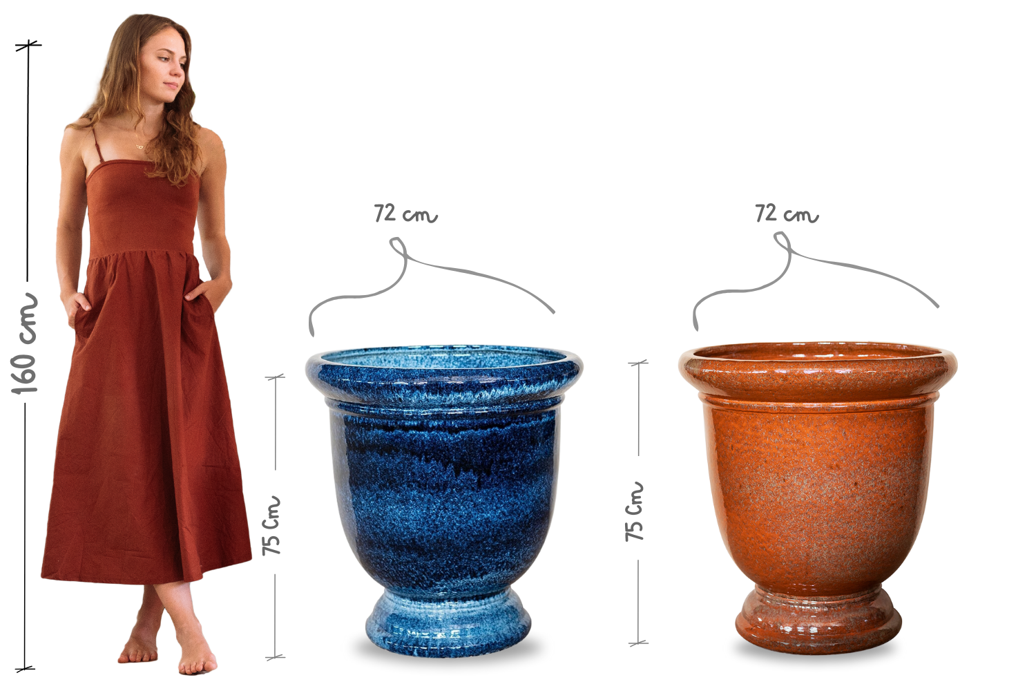 Květináč Titan je symbolem monumentální elegance a funkčnosti. Tento ručně vyráběný keramický květináč, navržený pro náročné milovníky rostlin, nabízí dostatek prostoru a stability pro velké stromy, palmy nebo olivovníky. Se svou výškou 75 cm se Titan řadí mezi největší květináče v naší nabídce, což z něj činí dominantu každého prostoru.